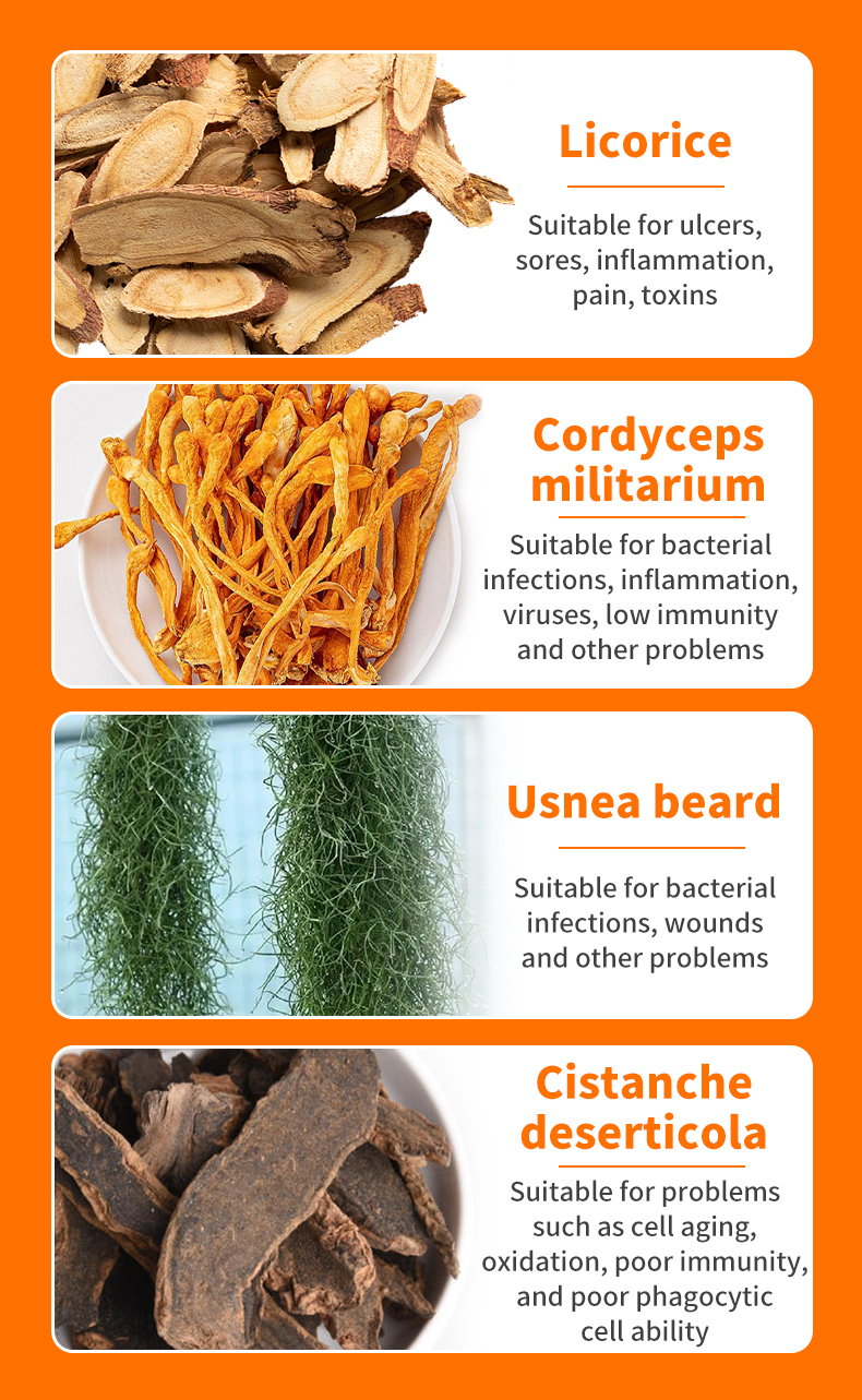 Colloidal silver, Cistanche extract, Cordyceps militaris extract, Usnea Barbata extract, Centella asiatica extract, licorice root extract, and Gentiana extract.